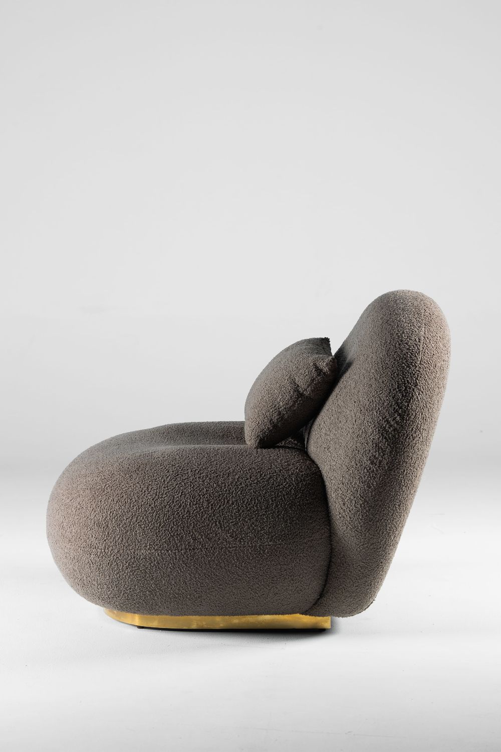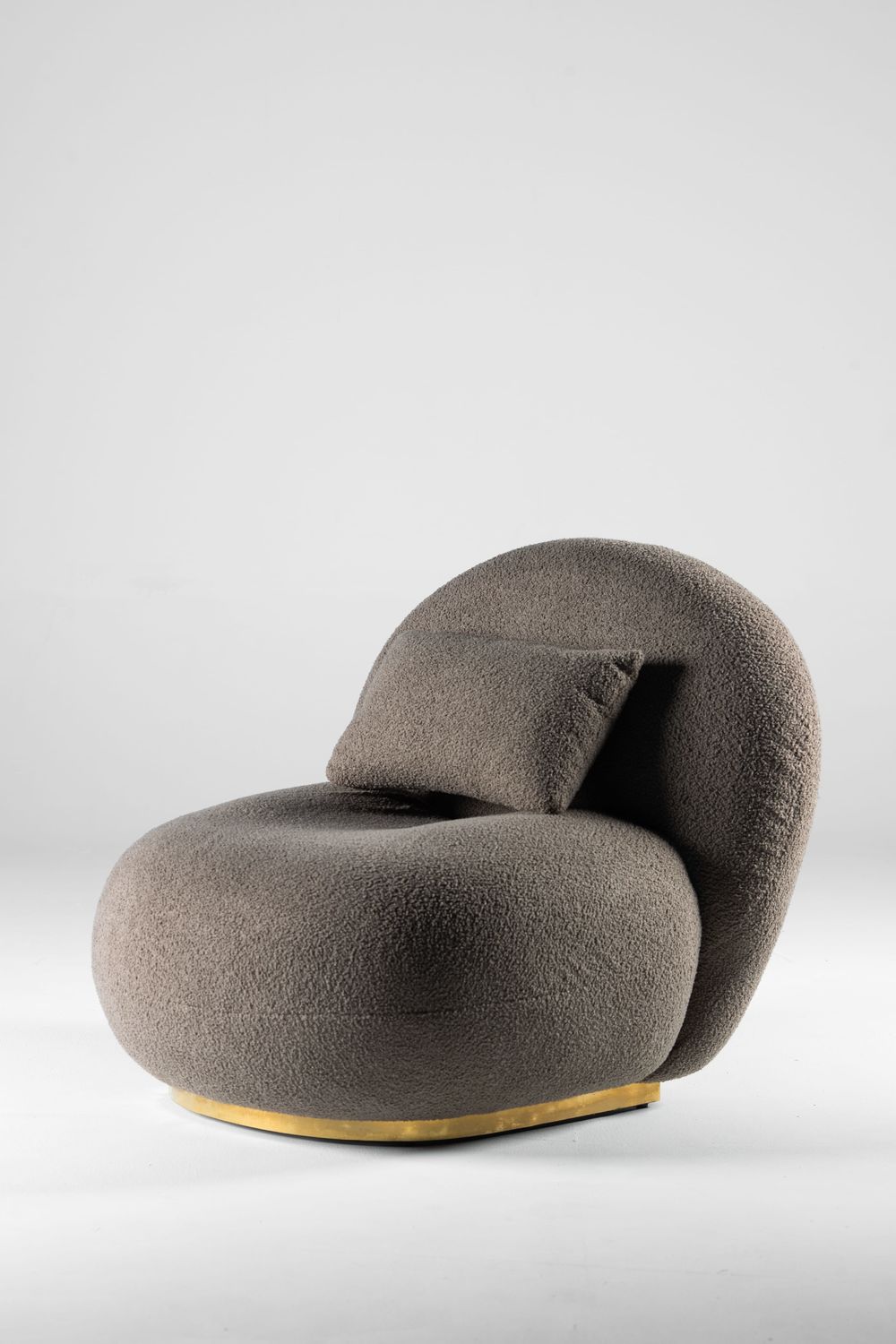 The Cocoon Comfort Lounge Chair is an invitation to ultimate relaxation with its curved and embracing design. It features a unique organic shape that envelops the sitter, generously padded and entirely covered in a thick, soft greige boucle fabric. The chair rests on a subtle, warm golden-toned wooden base, adding a touch of understated sophistication. Perfect for creating a cozy and inviting corner in a living room, bedroom, or reading nook.