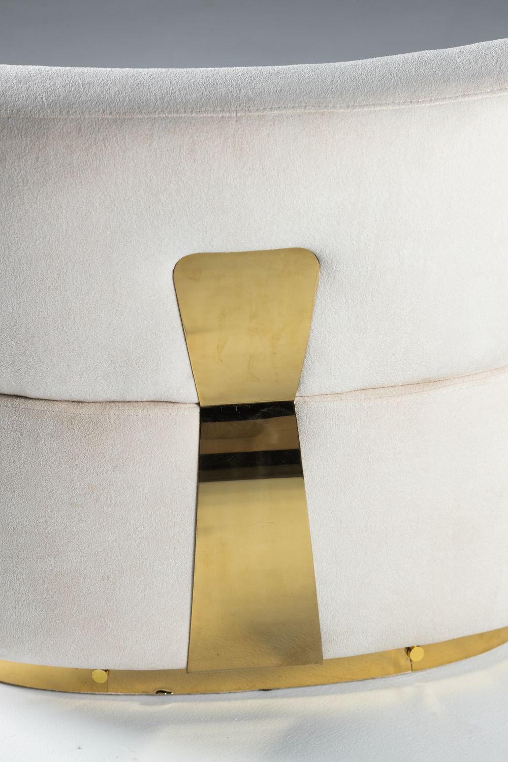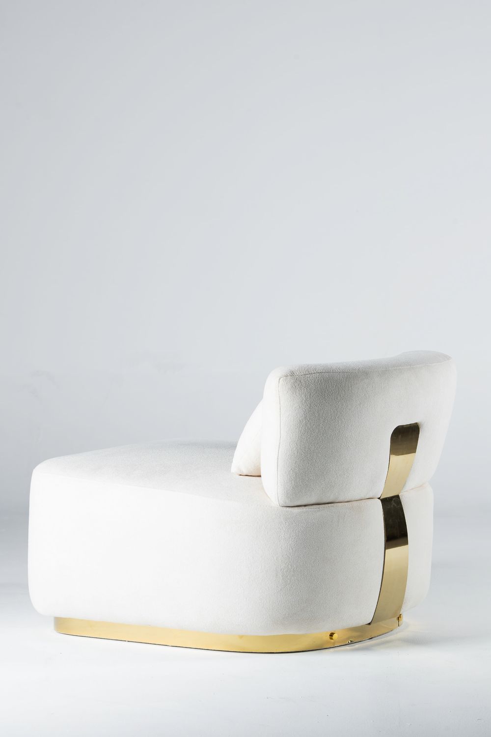 The Lumina Lounge Chair embodies timeless elegance and supreme comfort. It features a fluid, curved design and luxurious cream boucle upholstery, supported by a sleek, polished gold metallic base that wraps elegantly to add a touch of modern sophistication. A distinctive piece that brings charm and allure to any interior space.