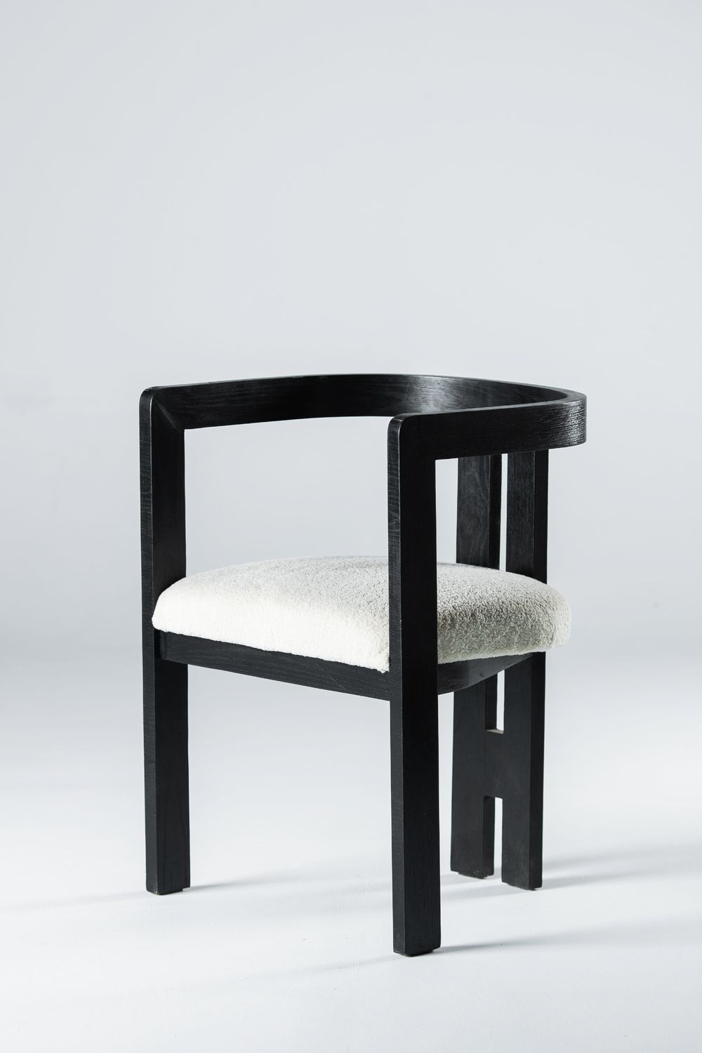 The Monolith Dining/Accent Chair embodies the strength of modern design and minimalist beauty. It features a rich, charcoal black solid wood frame that exudes dramatic character, with bold geometric lines and a comfortable seat upholstered in soft cream boucle fabric. The contrast between the dark black and the light fabric creates a striking and contemporary look. Perfect as a luxurious dining chair or a distinctive accent piece for any room.
